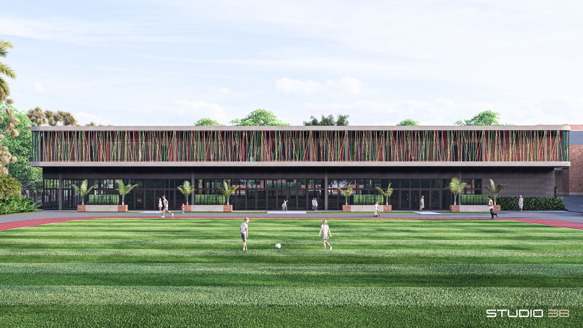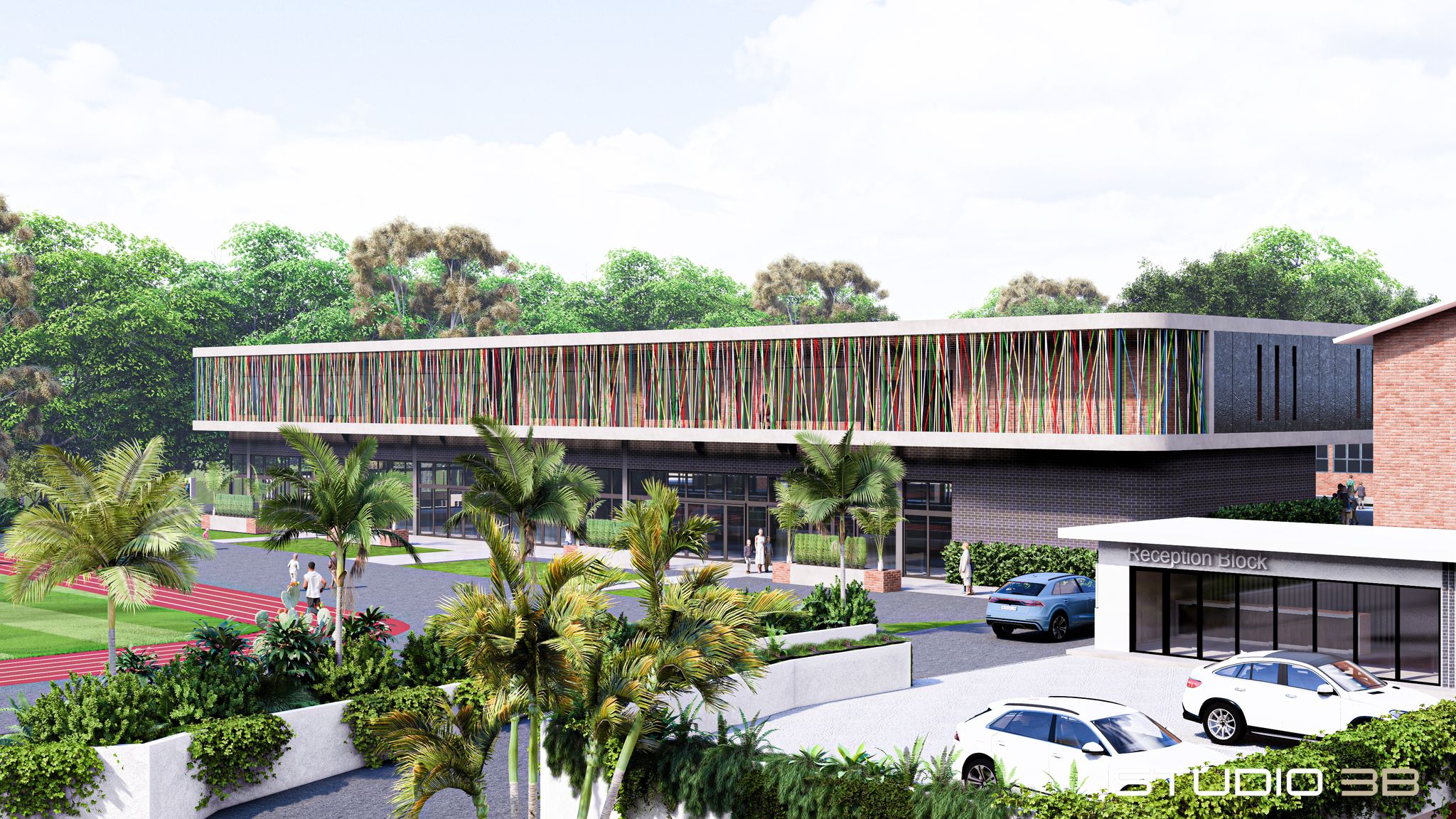 The brick, concrete facades and colourful steel rods deliver the architectural concept as the solidity of the playfulness hall elevations contrast with the organised rhythm of deeply recessed windows to the upper level classroom and multi-purpose area below. The hidden pitched roof lines and deep brick soffits maintain the simplicity of the building form, whilst subtle half brick header courses carry the existing school building horizontal lines through the new development. The main entrance is signalised by a large oversailing concrete / brick corner feature, with perforated brick effect to one elevation and a large brick opening to the other to emphasise the main entrance spatial experience through framed views and use of light / shadow.