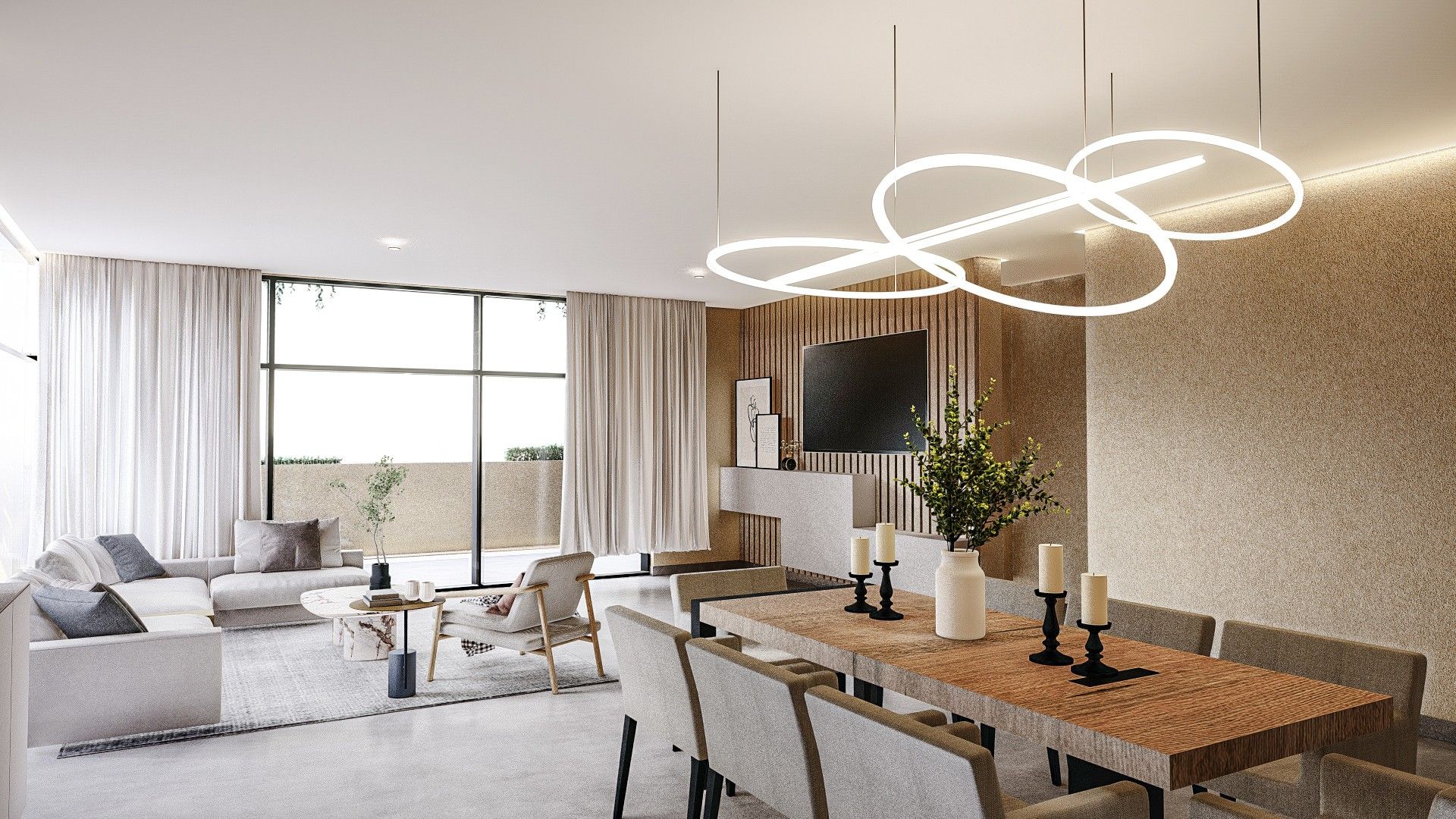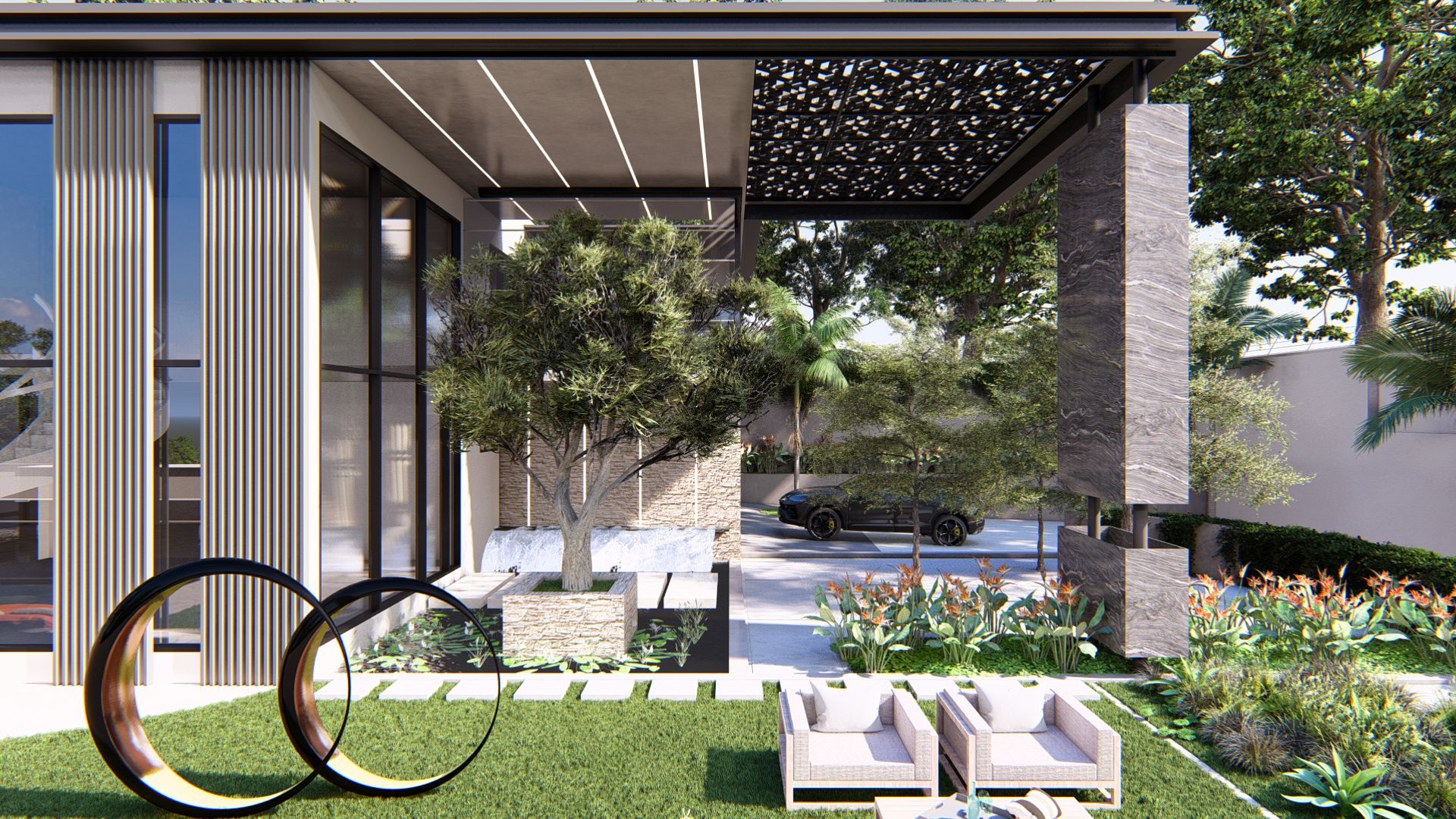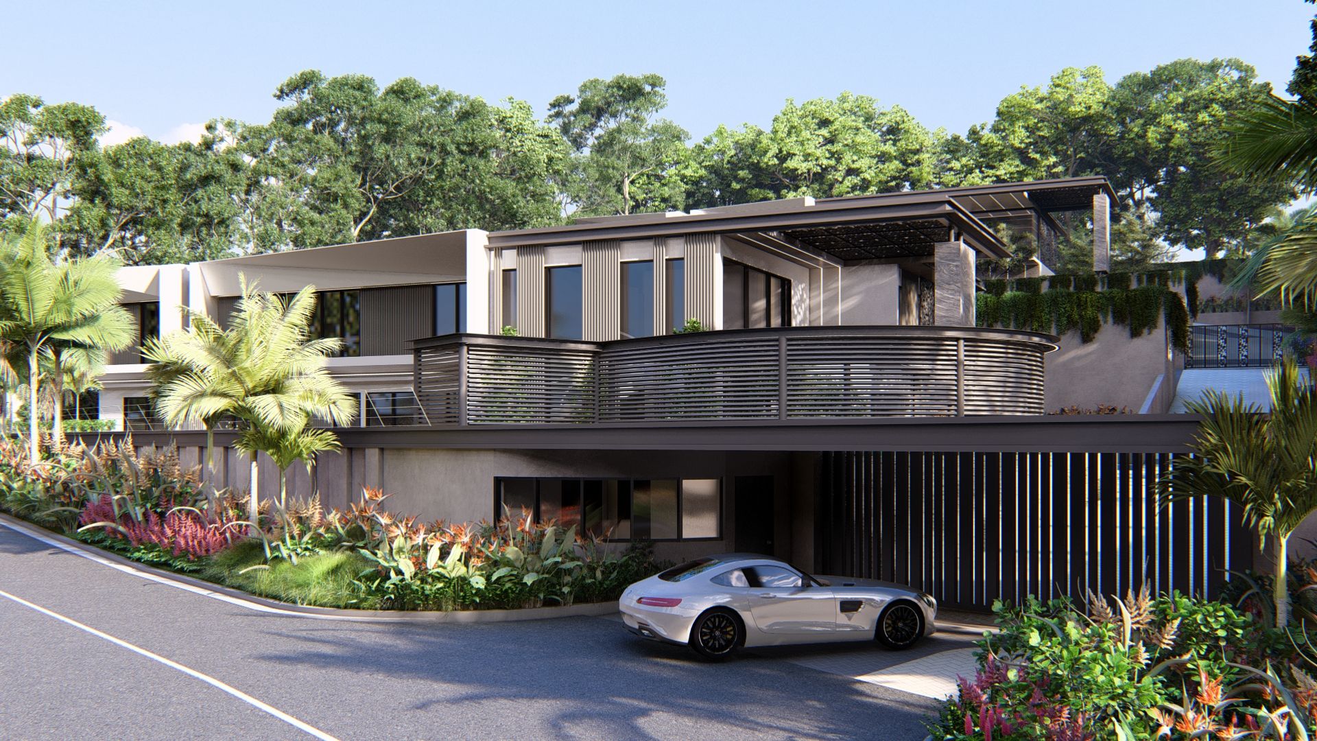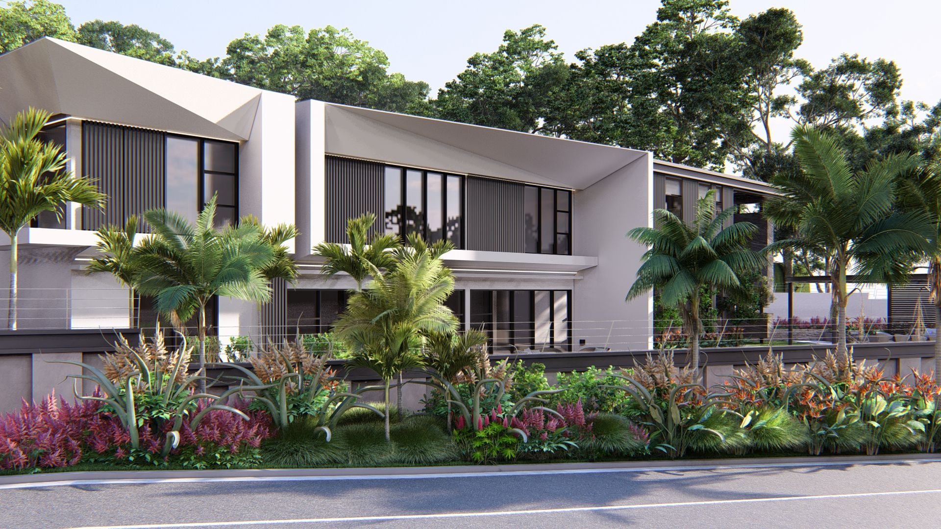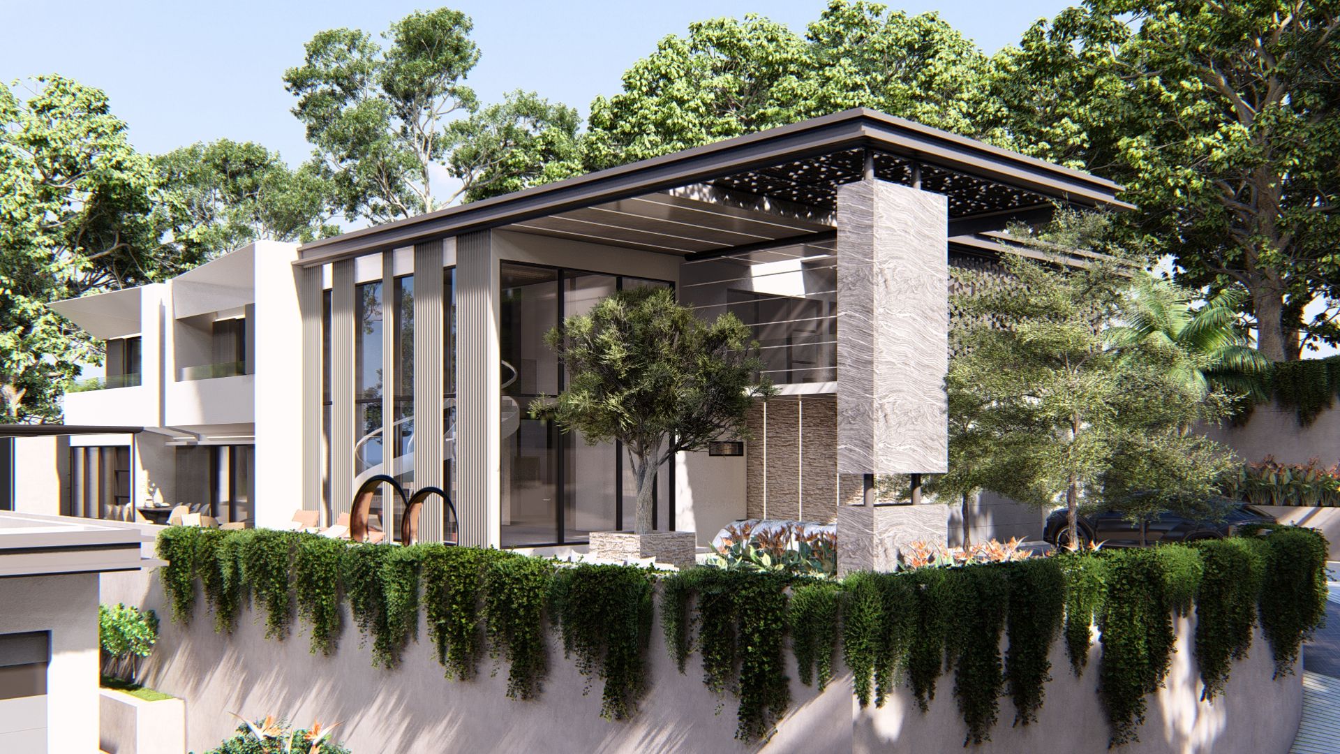 The development consists of three high-end luxury homes, each with shared entertainment spaces and private gardens. The architecture highlights refined detailing, with a façade that contrasts clean white horizontal lines against dark, blade-like pergolas that complement the dark window bands. This interplay of elements breaks up the building’s mass while creating engaging visual moments within a cohesive design. The selected material palette integrates seamlessly with the surrounding landscape, and the lush planting on each terrace softens the structure’s edges, blending it harmoniously with the environment.
