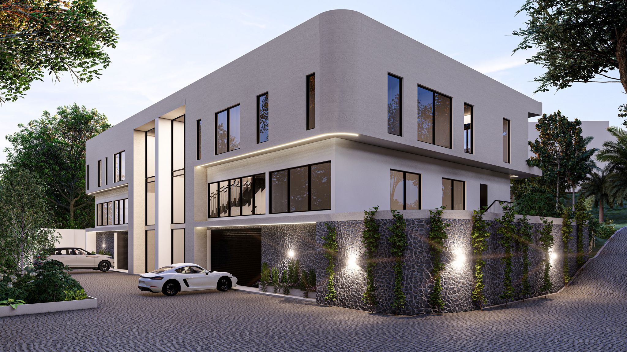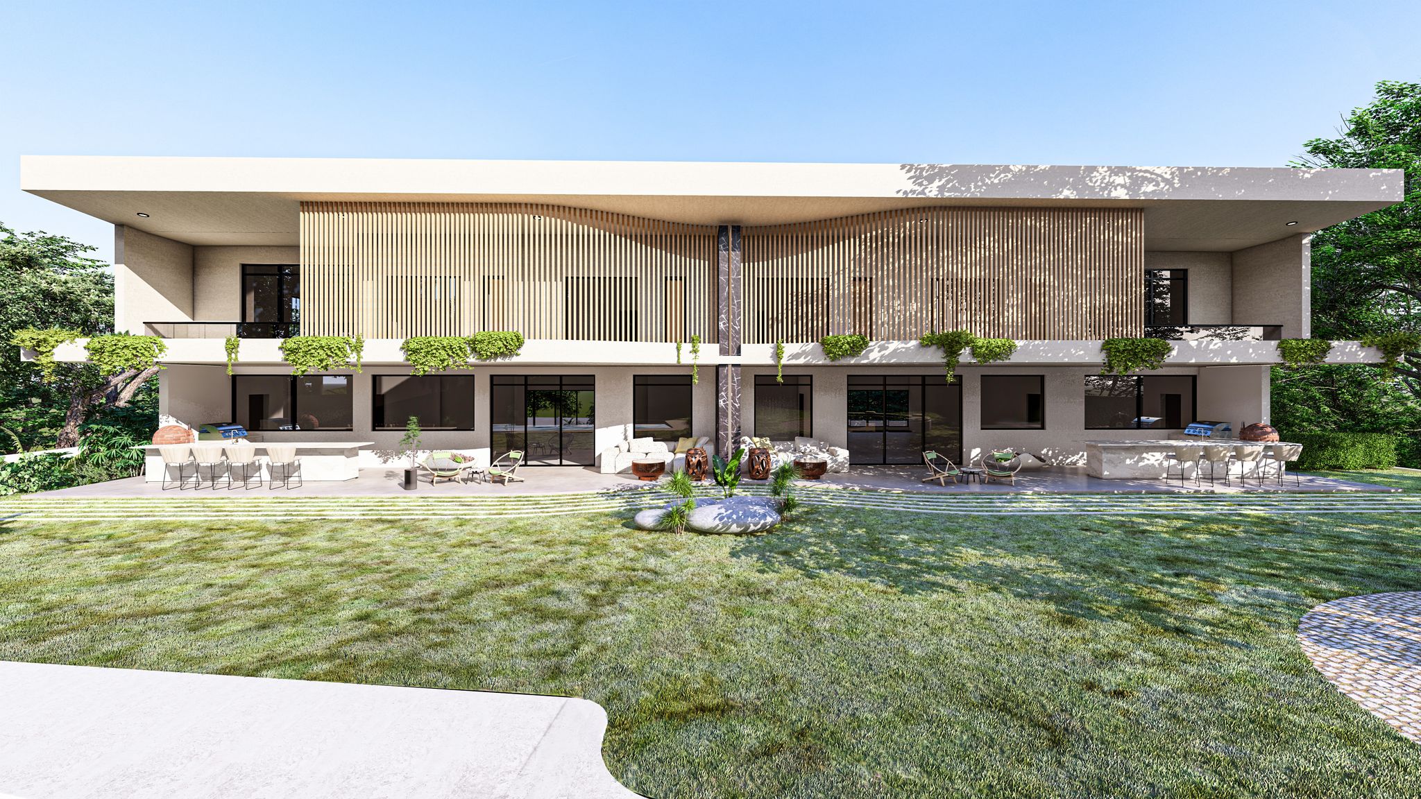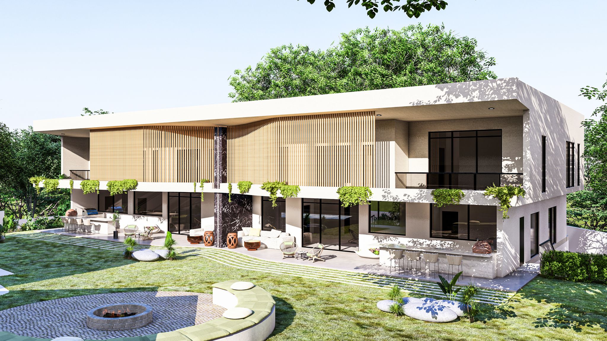 The Nordine House is an exploration of materiality, light, and the seamless integration of architecture within the terraced landscape. Located in the lush Greenfeld area of Westville, Durban, South Africa, the design emphasizes framing the surrounding garden with crisp, horizontal lines.